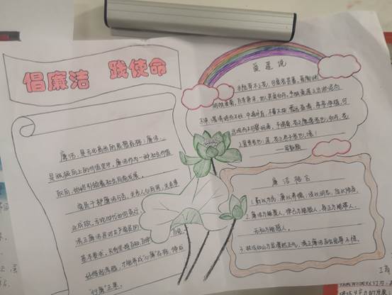 知廉敬廉,诚信守法。同学们纷纷参与活动,并充分搜集有关资料,对图片进行认真整理,设计并将有关资料抄誊在纸上,并以廉洁小故事、有关廉政的名言警句、廉政文化等多个版块进行展开,内容丰富。随后挑选出设计独特,书面整洁的作品,以供各位同学欣赏与进一步传播廉政知识,体会廉政内涵。清正廉洁自古以来就是中华民族的传统美德,也是我党的优良传统作风,坚持廉政建设是治理国家和稳固政权的基本支柱。
